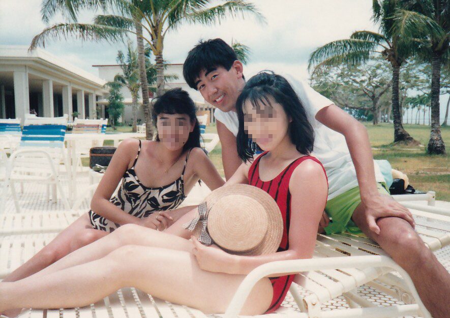 美女2人の間から、眩しそうな浮かれた表情のだらしない私(照)
